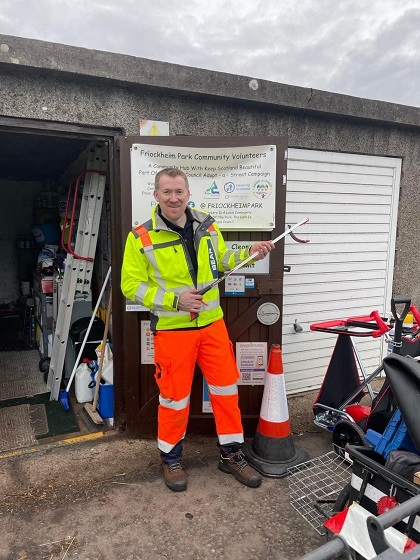 The Friockheim Community Park is run and managed by a team of volunteers led by the inspiring James Anderson, who is only 18. They manage the local public toilets, park and children’s play area, keeping them clean, tidy and fit for all to use. Kevin spent the day litter picking and cleaning the children’s play park, which was completely cleared and de-cluttered by the end of the day.